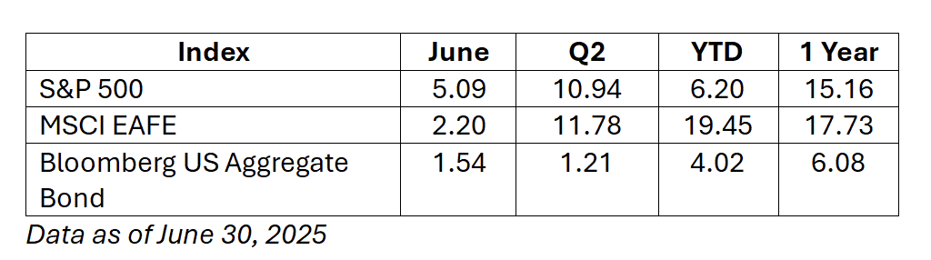 - US stocks rallied in June on optimism that tariff impacts would be less severe and the US economy would continue to grow. Q2 returns highlight a strong bounce back from Q1’s declines.